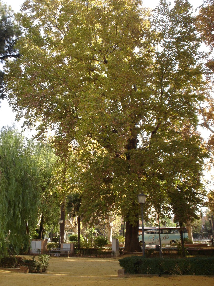 Platanus x hispánica ha sido –y aún es- el árbol de sombra por excelencia de las calles anchas de Sevilla .Sin embargo, su rápido crecimiento y su gran porte le impiden desarrollarse correctamente en la mayoría de calles, lo cual obliga a realizar podas severas que dan lugar a daños con frecuencia irreparables. Además, su sensibilidad a enfermedades de origen fúngico, junto con las condiciones cada vez más estresantes del medio urbano le provoca defoliación prematura y debilitamiento general.