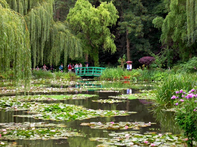 Claude Monet a Giverny. El pintor impresionista eligió este pequeño rincón de Normandía donde crear un jardín de inspiración y reposo. Cautivado por la luz y la fecundidad de estas tierras con un clima apropiado le hizo concebir un jardín dividido en dos partes: el de los caminos y parterres de flor con gran cromatismo y el del estanque, las ninfas y el puente japonés, omnipresentes en sus obras.