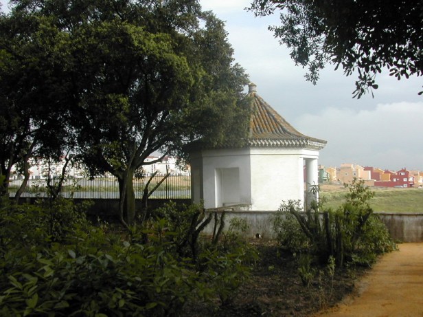 No obstante, el artista no puede sustraerse a sus gustos islamizantes y le permite ciertas concesiones a su propia persona, es el caso del cenador o pabellón de la parte izquierda del jardín: es octogonal, con pilares y columnas de tipo clásico, con un banco de mármol y el suelo de damero también de mármol, pero a quien se le ocurra penetrar en su interior y mirar hacia el techo se llevará una gran sorpresa, se encontrará balbuceante ante un artesonado de madera con formas estrelladas.