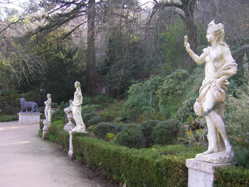 Un jardín excepcional de cinco hectáreas situado en una colina a las afueras de Sintra protegido, con magníficos arboles maduros proporcionan mucha sombra, con la siembra informal inteligente en grandes terrazas unidas por escaleras ocultas o caminos inclinados.