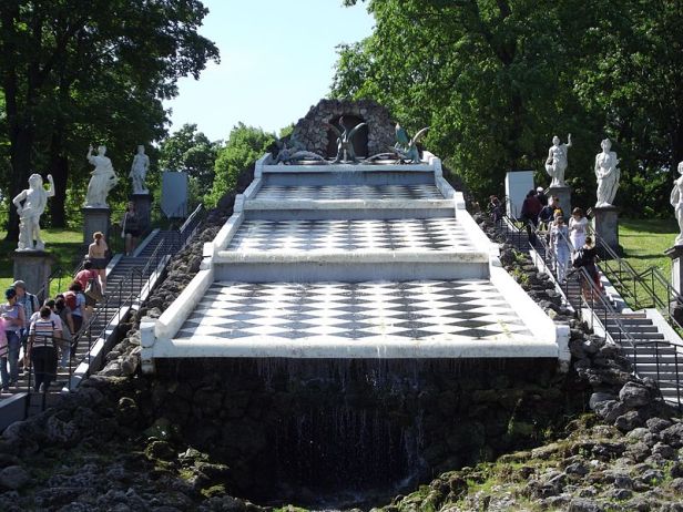 Lo mismo risco que proporciona un entorno para la Gran Cascada alberga otras dos cascadas muy diferentes,. Al Oeste del Gran Palacio está la montaña de oro , decorado con estatuas de mármol que contrasta con las figuras doradas de la Gran Cascada. Al este se encuentra la montaña de Ajedrez , una amplia rampa, cuya superficie es de baldosas blancas y negra como un tablero de ajedrez . Las fuentes más prominentes posicionadas en Peterhof son las de ‘Adán’ y ‘Eva’. Que ocupan posiciones simétricas a ambos lados del canal del mar.