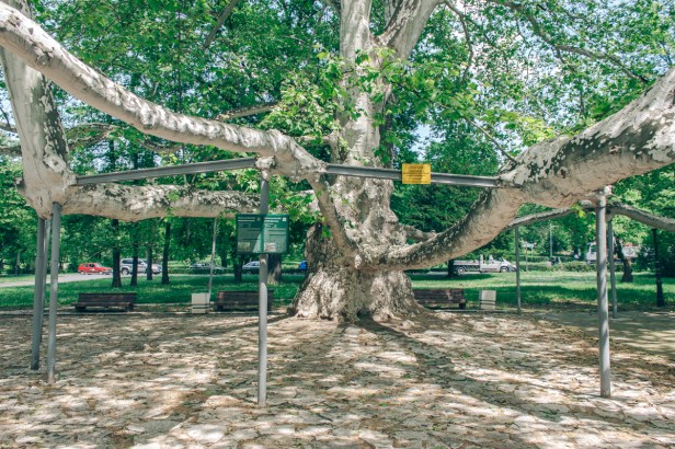 El espécimen más grande y más antigua, protegida por el Estado, se encuentra a 34 metros de altura y el diámetro de la cubierta es de 55 metros, mientras que la sombra de su corona tiene una superficie de 1.400 metros cuadrados . Algunas fuentes afirman que fue plantado en 1834, cuando el príncipe Miloš ordenó para una planta de semillero para ser plantado en el horno de cal en la parte delantera de la konak . Otras fuentes, más fiables dicen que el árbol fue plantado en 1868, cuando 250 plántulas de Platanus fueron comprados en Viena , Austria-Hungría , de lo que hay un recibo que todavía existe hoy en día.