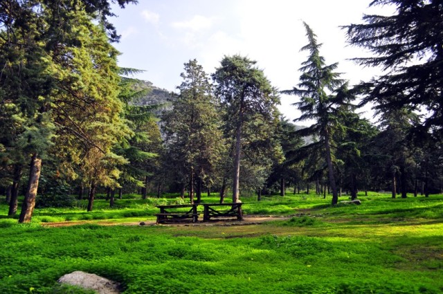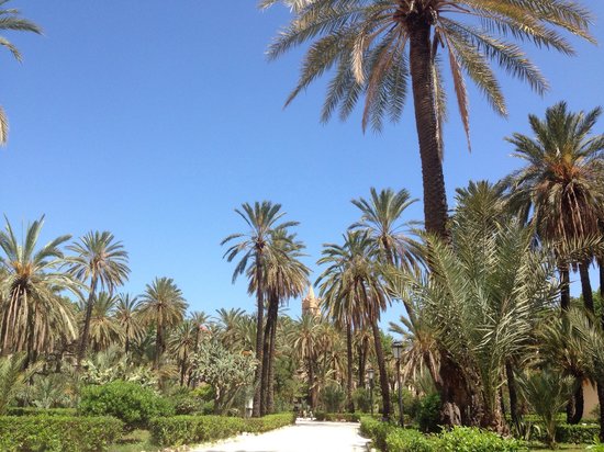 De hecho, después de la entrada, frente al centro de la ciudad vieja, que ‘va’ – la proporción más alta de la planta – un gran claro rodeado de un «bosque» densa de coníferas y árboles de hoja perenne otros, en el quiosco de música, el teatro, un grupo de Washingtonia robusta en un baño de agua y algo de imponente Cedrus libani son los ‘elementos monumentales’.