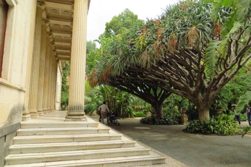 No muy lejos se puede ver la planta más alta de los jardines, una magnífica Araucaria columnaris , y la mayor en general en términos de volumen, un espécimen gigantesca de Ficus macrophylla , con sus típicas raíces aéreas , importados de la isla de Norfolk (un territorio de Australia en el Océano Pacífico ), en 1845. También es un árbol nativo de la costa este de Australia y es conocido como la Bahía de Moreton Fig . Varias especies de bambú crecen cerca y directamente detrás encima de una pequeña colina artificial, hay un espécimen sano del árbol del drago ( Dracaena draco ).