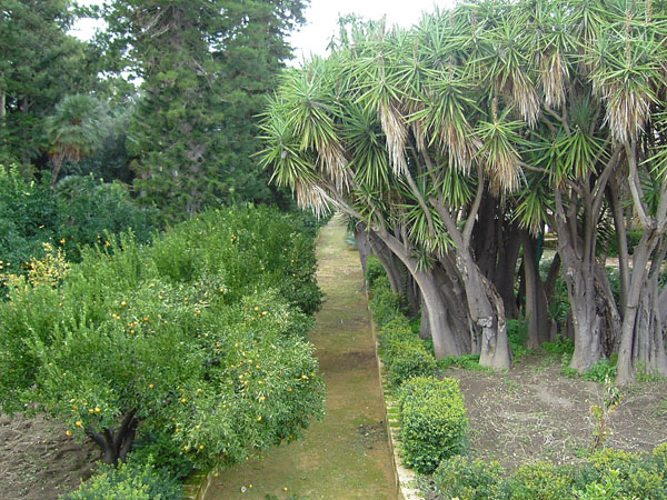 Una plantación de cítricos siendo regadas con este método tradicional y un viñedo de antiguas variedades locales son el escenario de una colección botánica de las plantas de muchos países tropicales, en el jardín, entonces el jardín; porque en Sicilia «jardín» y la plantación de cítricos y «villa» es el jardín ornamental.