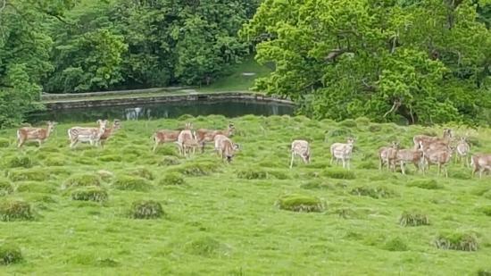 El parque de mediados del siglo XVIII cae abruptamente hacia el este hasta el río Wye, que serpentea alrededor de la parte inferior de los acantilados boscosos.