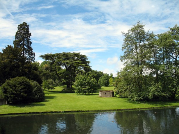 Los terrenos están divididos por el río Cam , que es atravesado por varios puentes ornamentales, y una carretera principal que sigue el trazado de una calzada romana .