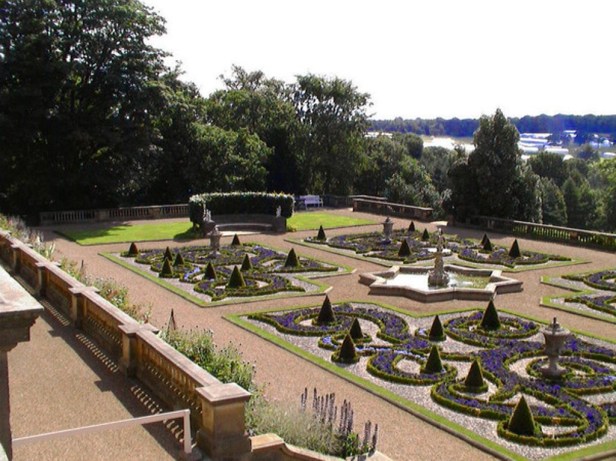 El diseño, con terrazas, barandillas y escalones, se entiende mejor como una interpretación en inglés de un jardín italiano del siglo XVII.