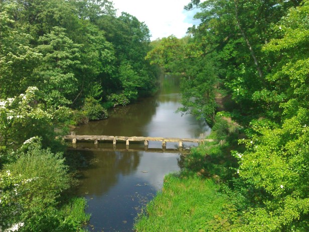Strid Chatworth es un tramo de aguas tranquilas rodeadas de rocas y la vegetación exuberante cruzada por un puente rústico.