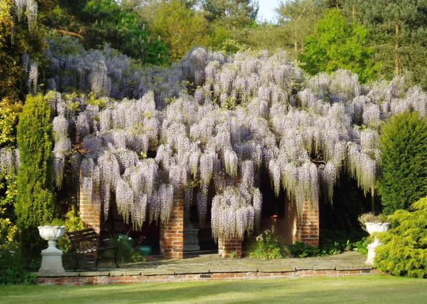 Hay una creciente glicina a lo largo de una de las paredes, las rosas, las trepadoras, las plantas perennes y bulbos.