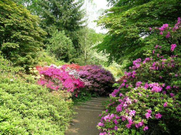 A mediados de la primavera los rododendros y azaleas están en su pico y lleno de colores vibrantes, y el bosque está alfombrado en franjas de prímulas y campanillas. La impresionante Azalea Bowl es un imán para los visitantes de todo el mundo a principios de mayo. La plena floración de las herbáceas y el Jardín Exótico anuncian la llegada del verano, la orilla del río con frescos y sombreados paseos, senderos familiares y días de campo por los estanques favorecidos de actividades