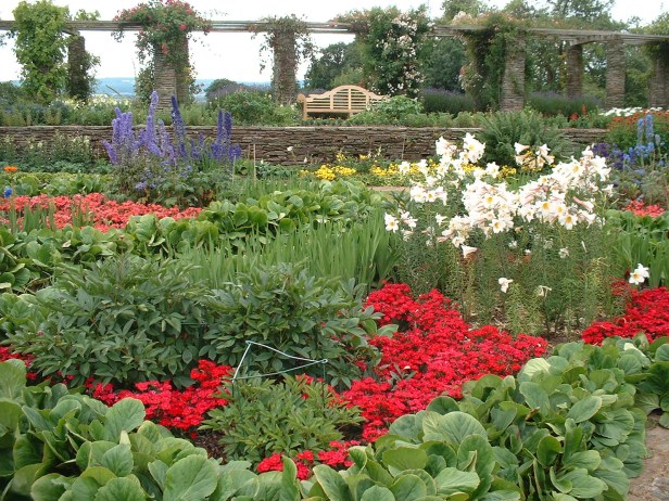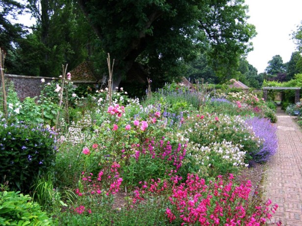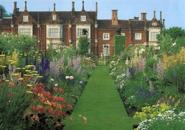 La frontera principal .- Esta frontera tiene 35 metros de largo y su mejor momento es en verano. Las flores azules y amarillas, a través de los cremas y los albaricoques a rosas, malvas y rojos. Hay un jardín blanco de contraste tranquilo más allá .