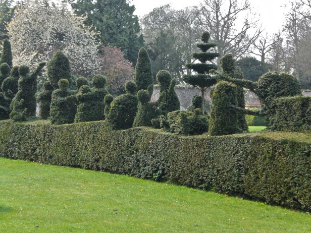 Los tejos antiguos y los cedros.-Algunos de los tejos son de edad muy avanzada, otros son de plantación más reciente. El recorte los antiguos, a unos 50 pies. de altura, en las formas geométricas y los modernos en topiaria (como sorprendente Flautista de Judith) son parte de los cambios recientes.