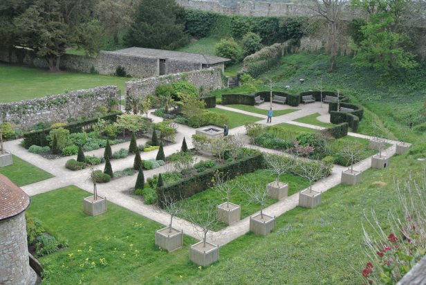 Un aspecto inusual del jardín es un huerto de árboles frutales que proporcionan un dosel de flor en primavera y en otoño de fruta para los visitantes a pasear bajo. Los árboles están contenidos en macetas grandes de modo que sus raíces no dañen los restos arqueológicos de un edificio del siglo XIII recientemente descubierto.