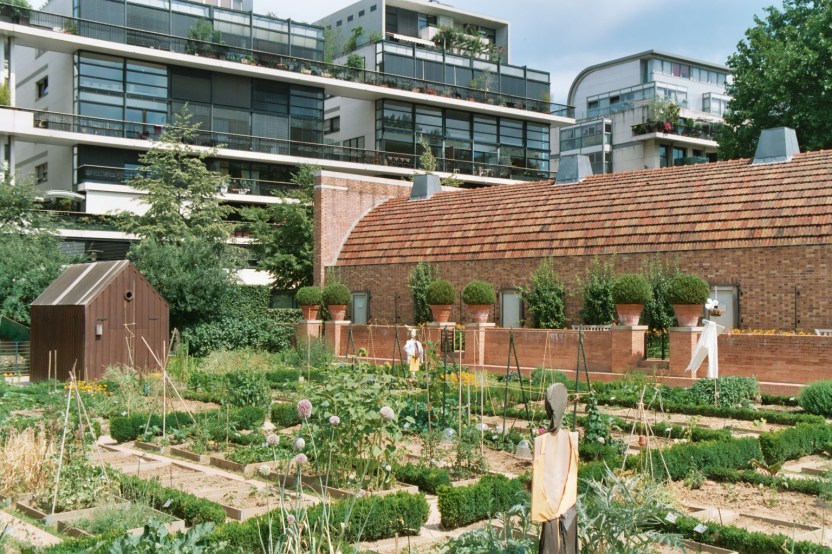 A lo largo de estos tres jardines en la parte del Sena , el muro separa el ruido del tráfico desde el Quai de Bercy, y los anfitriones de las instalaciones deportivas municipales.