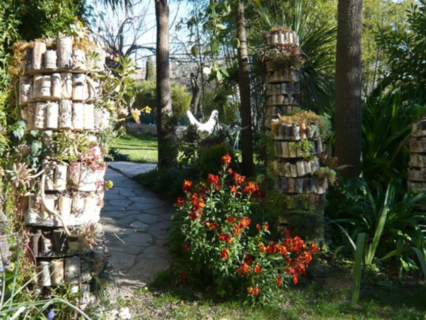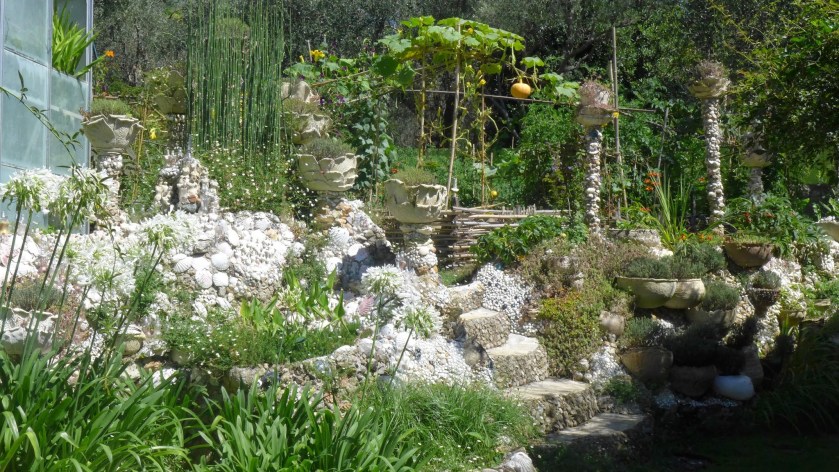 El jardín está estructurado por 12 grandes olivos, que se inclinan suavemente alrededor de la vivienda. Se compone de una sucesión de pequeños jardines inusuales y lúdicos donde las plantas raras y vagando entre muchas creaciones abstractas o figurativas de arcilla. Un huerto se compone de 12 cuadrados de tejido de bambú que desaparecen en verano en muchas variedades antiguas de tomate y otras verduras y flores anuales. Tres pequeños invernaderos hexagonales albergan las plantas más delicadas en invierno. Algunos pequeños estanques permiten el cultivo de plantas de humedales.: flores de la arcilla de la cerámica en las barras de encaje en el camino de entrada. bolas de arcilla (aproximadamente 100) a partir de bolas de boj. Tanto el bambú arcilla de porcelana, loza y la tierra llena de humo en cierto bambú negro. Paredes frascos que llevan conchas corales fósiles. columnas de arcilla y arcilla mezcla de vegetación. Los guardianes de arcilla del jardín apoyan un verano exuberante.