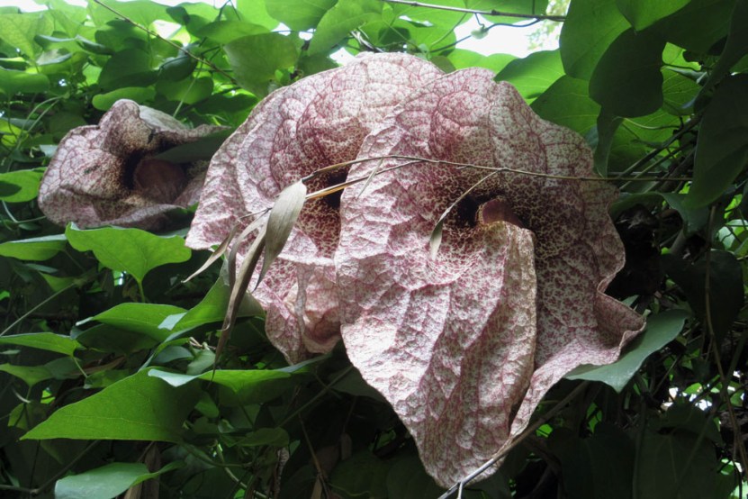 La formalidad se hizo cargo cuando nos acercamos a la casa a lo largo de un camino bordeado de Bujlbine alooides , Ophiopogon, Aeoniums, incluyendo el sorprendente oscuro de hoja Aeonium arboreum var. atropurpureum y el cultivar aún más sorprendente, ‘Zwartkop’, casi totalmente negro como su nombre Afrikaaner ( ‘Cabeza Negro’) sugiere. El desviarse hacia la derecha hicimos una pausa para admirar una zona densa de bambú, sobre todo Dendrocalamus . Más especímenes exóticos esperaban en el abordaje de los extensos invernaderos, y la no menos importante Aristolochia gigantea