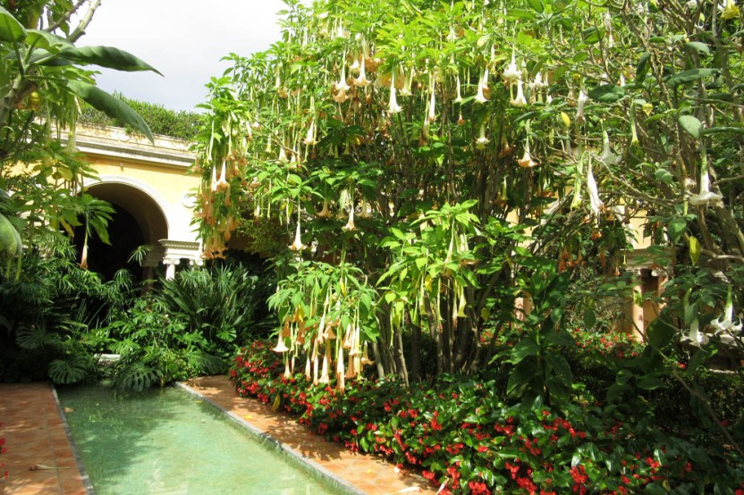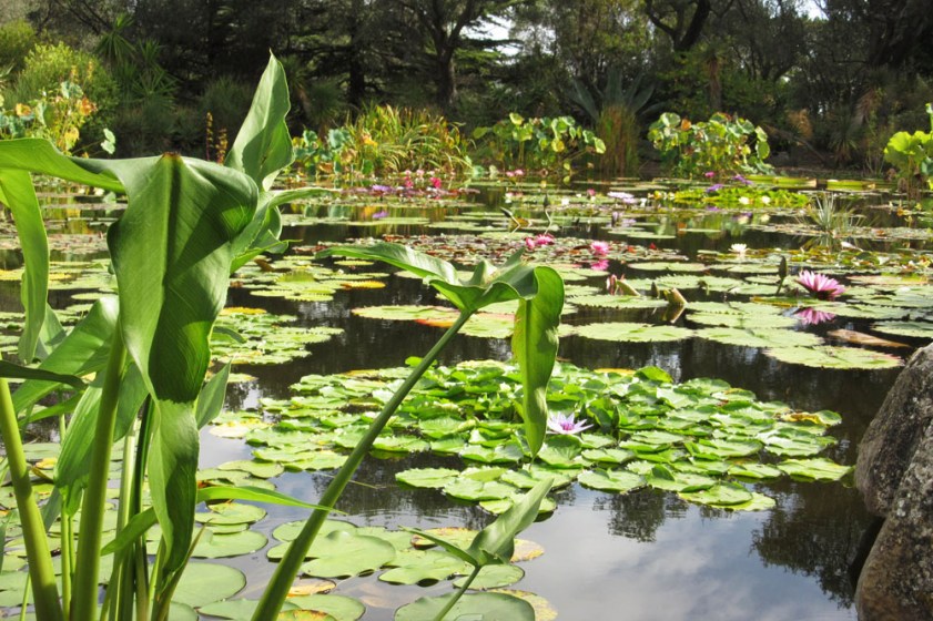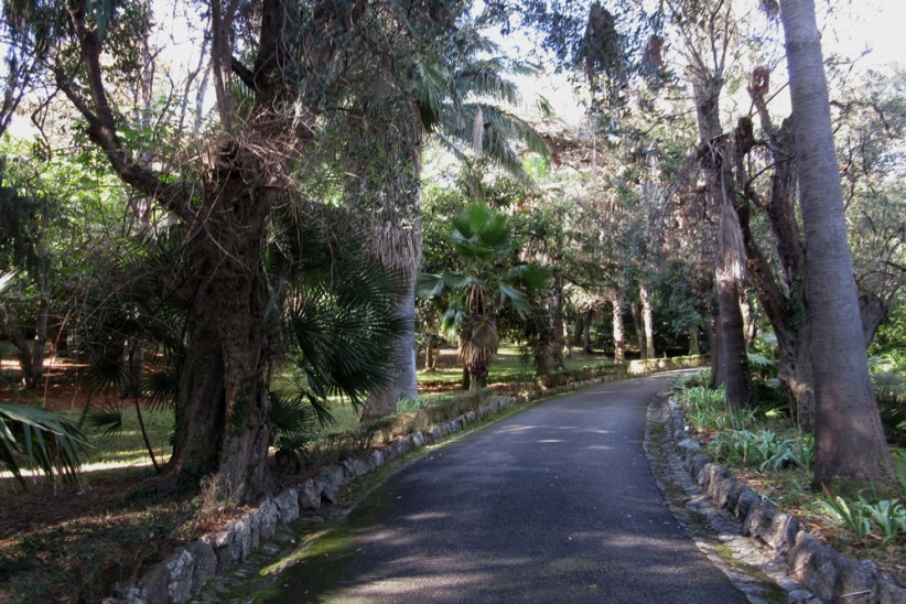 Felipe nos condujo hasta el camino con árboles de sombra, la sombra de Podocarpus, una variedad de palmeras, en especial Washingtonia robusta y filifera W. , Jubaea chilensis , la palma chilena del vino con su enorme tronco, el pino de Wollemi ( Wollemia nobilis , que se creía extinta hasta su redescubrimiento vivo y bien en Australia en 1993 y ahora está replantado en todo el mundo), el bien llamado Osmanthus fragrantissima , varios árboles de algarrobo ( Ceratonia siliqua ), los granos de los cuales se han utilizado como un sustituto de chocolate, además de ser el origen de la quilates , Araucaria bidwillii , un enorme Cupressus cashmeriana y Citrus aurantium var. myrtifolia .-naranjo moruno.- , utilizado en Italia para hacer la bebida gaseosa agridulce Chinotto), antes de emerger al lado del magnífico estanque.