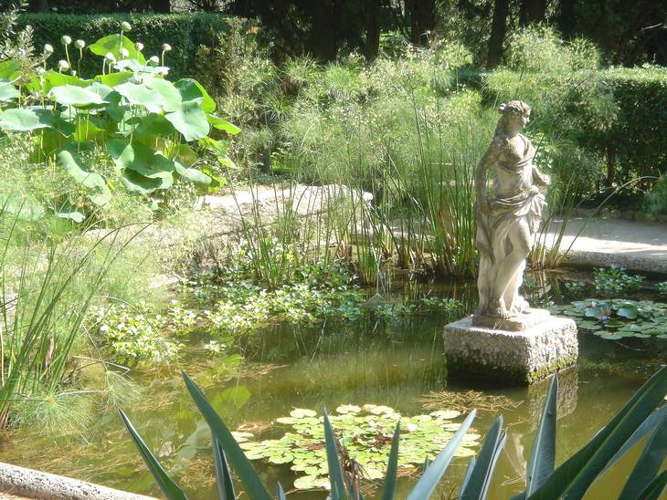 Más allá de la terraza hay un parque con palmeras y un estanque largo, adornado con fuentes, estatuas, y los estanques con nenúfares y otras plantas acuáticas.