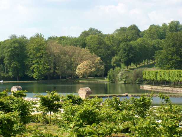 El parque está diseñado como una doble perspectiva, una en el centro del castillo, otra de la llanura de cuatro estatuas, y las otras perpendiculares si las cascadas que bordean el Gran Canal. Estas perspectivas están enmarcadas por grandes zonas boscosas fragmentadas con grandes caminos rectos. El eje de la trayectoria de honor, cortando de este a oeste del castillo, tiene la entrada honor, la parte delantera de la cancha, el tribunal del castillo y el propio castillo en un lado.