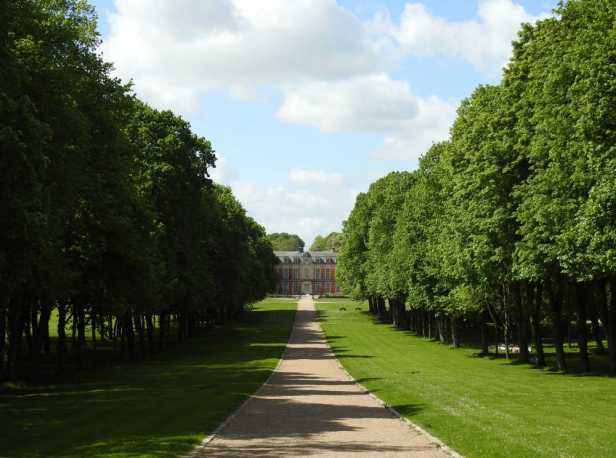 La llegada al palacio se realiza por una avenida bilateral de 257 plátanos. Las dos hileras de árboles están muy próximas, tan sólo las separan 6 metros por lo que, al juntarse las ramas de ambas líneas, se provoca un efecto de túnel impresionante. La avenida tiene una longitud de 1.400 metros y está clasificada como monumento histórico.