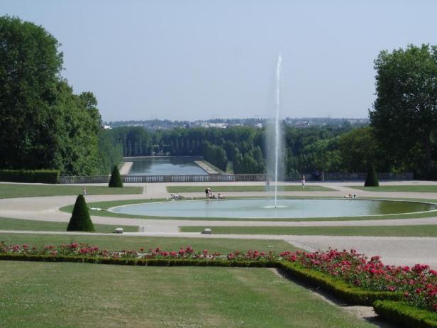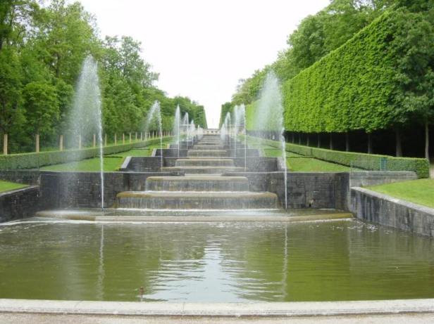Por otra los jardines de flores se despliegan con estanques y fuentes de agua; llanura llamada la alfombra verde de las cuatro estatuas. El eje del pasillo de la duquesa dejó el norte, una pequeña semicircular «media luna», que sirvió como depósito (ahora difunto); que se extiende a través del pasillo de Diana, continúa en la terraza del castillo por el pasillo de la alfombra verde (anteriormente fueron a la duquesa) que conduce a la gran cascada (restaurada en un estilo moderno en 1930), la chorros de flujo de agua en varias cuencas hasta cuenca octogonal y chorro de agua central. La cuenca está conectada por un pequeño canal en el gran canal que forma un segundo eje perpendicular a la del castillo. A lo largo de un kilómetro, el Gran Canal tiene un juego de curvas y rectas. Las aves de Guinea de la terraza norte y la vista del canal son hermosas.