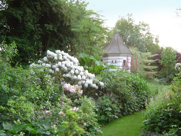 En 1990, la imaginación y pasión por las plantas inspiraron a su propietaria a ampliar los límites del jardín. El huerto de origen y una parcela colindante se transformaron en un hermoso jardín, inspirado en los modelos ingleses.