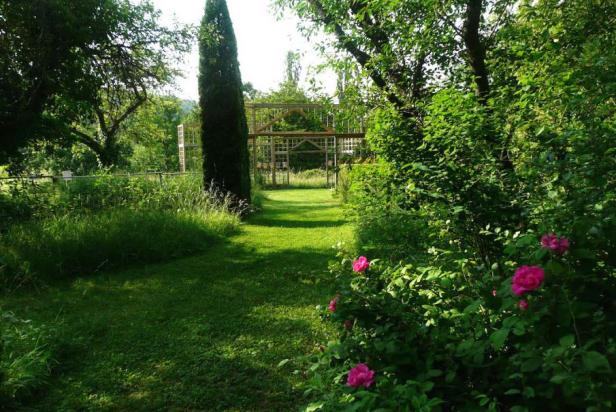 Un Cenador en el jardín rodeado de casas de una colección de rosas galas en memoria de Rosa Gallica (o Provins ) la primera rosa la trajo de vuelta a Francia alrededor de 1240 por Thibaud de Champagne, al regresar de las cruzadas. Parte superior de la fosa, verduras contenidas en el Chapterhouse de Villis (Carlomagno Un 800), granos antiguos y legumbres se cultivan en placas dibujadas en el plano de la Abbey de St. Gall. Níspero, castañas, membrillos, manzanos y perales, ciruelos también encuentran su lugar en estos jardines.