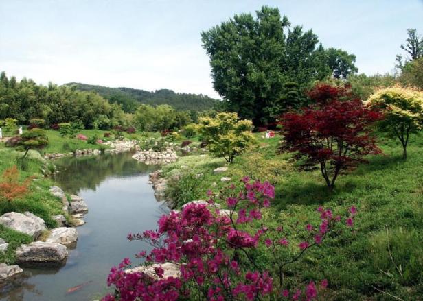 Jardín tipo Inglés, Arboretum, Country, contemporáneo, vegetales con elementos notables: Pabellón, Quiosco, puente, fuente, cascada, curso de agua, zona de aguas características de las plantas: árboles de alineación, árboles frutales, arbustos árboles de alineación: Árboles frutales, ciprés de Italia: manzana, pera, caqui espaldera, azufaifo ,colección de arbustos en flor .