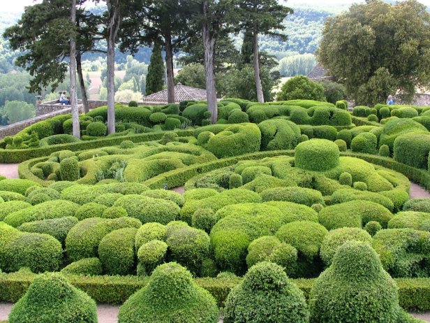 En Marqueyssac, la topiaria pone el boj en valor con una completa fantasía de movimientos. El trazado de los caminos sinuosos es típico de jardinería hecho en Francia bajo Napoleón III . La redondez y el balance del boj dan suavidad y romanticismo a Marqueyssac , lo que contribuye a la armonía de los jardines con las colinas del valle del Dordoña , son inseparables.