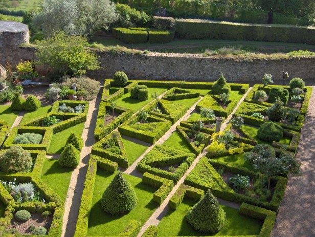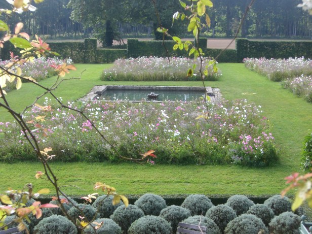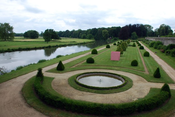 Ocho parterres de bordados de boj están dispuestos simétricamente en la parte delantera de la casa, en el eje principal. Una larga pérgola-rústica inspirada en reemplazar un ala destruida de la casa y proporciona acceso a una sala de tallado de tejo verde, con la distinción de ser cortado a la «chinesca». Un pequeño claustro inclinado a dos aguas al norte de la casa consta de cuatro cuadrados de boj. La parte trasera de la casa está dominado por una terraza que se extiende en toda su longitud. La terraza da a una plaza grande, dividido en cuatro, donde las calles están llenas de tejo podados en topiaria y enrejados tilos italianos. El conjunto está cerrado por un seto cortado en festonnages. A setenta metros de largo se extiende hacia abajo, en el río: este conjunto está diseñado de terrazas italianas. El borde del espejo se plantan árboles planos más allá del cual el desierto se hace cargo. El visitante exigente reconocerá en esta composición ecléctica, elementos del jardín manierista franco-italiana, también los de los holandeses, jardínes del siglo XVII, a través de las artes y oficios ,Arts & Crafts,y el jardín Inglés de principios del siglo XX en Inglaterra.