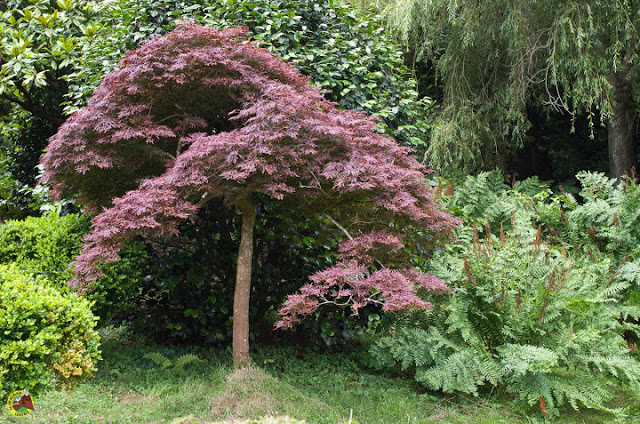 Un bonsái japonés «Acer palmatum atropurpurea» con más de 250 años. Metrosideros excelsa de Guayana o árbol de hierro, que fue de los primeros en plantarse en el jardín.