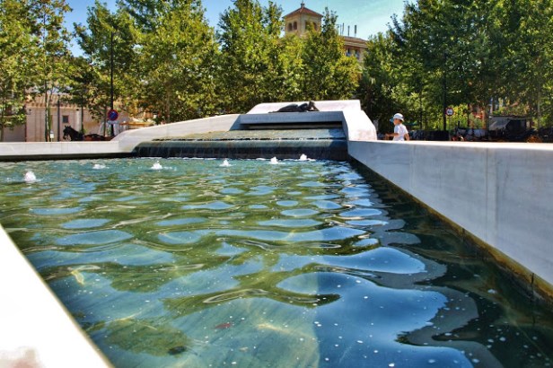 En la zona peatonalizada que unen los jardines con la Puerta de Jerez se ha construido una fuente en mármol blanco de Macael con la siguiente inscripción: