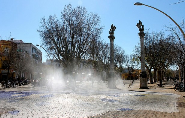 En Sevilla la sombra es fundamental en instalaciones al aire libre, zonas de sombra y de soleamiento para mayor comodidad de la paseante y mejor calidad de vida.
