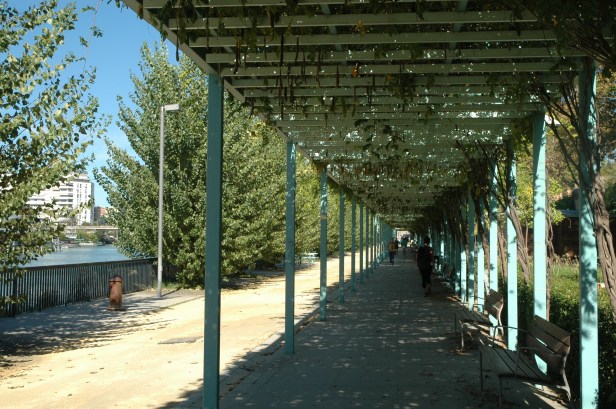 Una pérgola en paralelo con la alineación de árboles cubierta de glicinas.-Wisteria sinensis y un seto de arrayan.-Mirthus communis proporciona protección con sombra a los paseantes, la pérgola está perfectamente dotada de bancos, fuentes de beber, pavimentada e iluminada.
