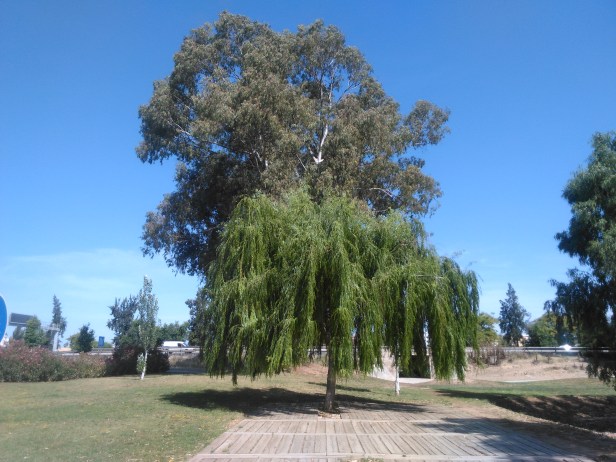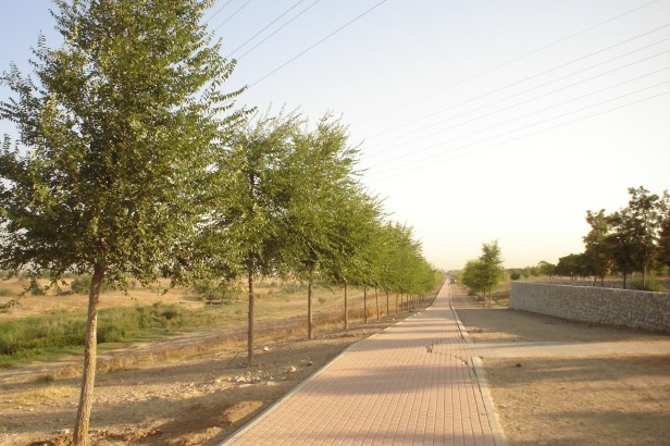 El paseo lineal con el carril bici sigue plantado de olmos.-Ulmus “ Nanguen “= Lutetia.-olmo hibrido resistente a la grafiosis o mal holandés del olmo excepto en la zona donde cruzan una líneas eléctricas de alta tensión y de forma aislada diversificados o formando conjuntos aparecen los álamos blancos.-Populus alba, los sauces.-Salix babylonica, mimosa .-Acacia cyanophylla y mimbreras junto a las balsa de agua.