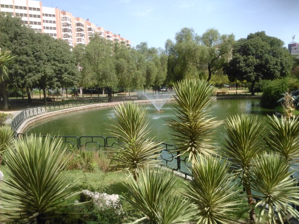Llegamos así al enorme estanque central que rodeado por “pica picas” (Lagunaria patersonii) y jacarandas (Jacaranda mimosaefolia) conforma el principal espacio abierto del parque. Desde esta agradable área nos dirigimos hacia el norte a través de falsos pimenteros, boneteros, pitósporos y árboles del amor recorriendo un largo paseo que nos lleva hacia la periferia del parque. En el camino por este paseo y dirigiéndonos hacia la última de las plazas enclavadas en la avenida central, la plaza semicircular, encontramos plátanos, arces, casuarinas, parquinsonias (Parkinsonia aculeata), así como jaboneros, ombúes y alguna palmera datilera.