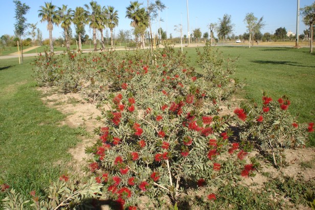 El recorrido termina en dos parterres pensados para albergar, por un lado, especies de origen continental como el sauce llorón, un magnolio, eleagnos, hibiscos, trompeteros y árboles de Júpiter. Por el otro, especies de ambiente subtropical entre las que contamos con limpiatubos (Callistemon speciosus), flor de pascua, drácenas y una filica. Llegamos así al inicio del parque, guiados por un brachichito de flor roja, un aromo blanco y un palo borracho.