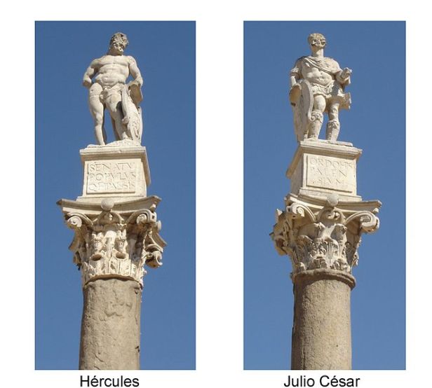 Dos grandes columnas romanas con grandiosos capiteles corintios trasladados allí desde diferentes puntos de la ciudad, serían coronadas por sendas estatuas, una representando a Hércules (que completaría el topónimo aún vigente) y otra a Julio César. El primero tenido por legendario fundador de la ciudad y el otro por el que la cerró con murallas considerándola ciudad merecedora de tal protección. Las dos esculturas se asientan sobre pedestales situados sobre los capiteles, lo que confiere a las dos columnas carácter de monumentos de gran esbeltez.