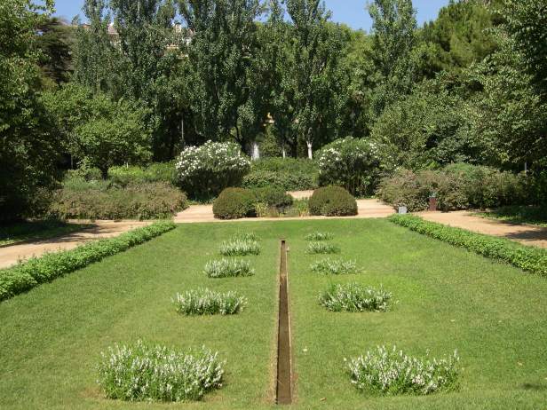 A ambos lados de este eje central se sitúan grandes parterres regulares de césped muy soleados y surcados por pequeños caminos.