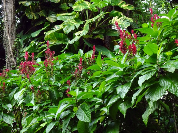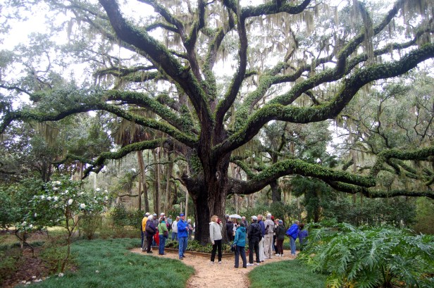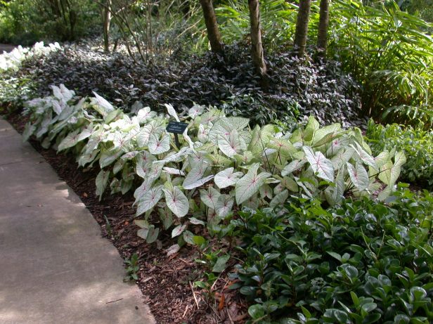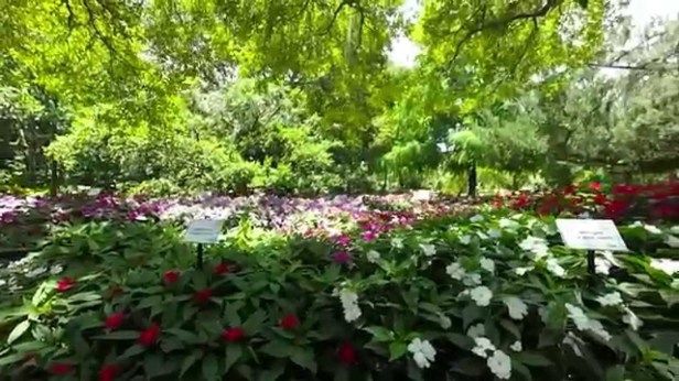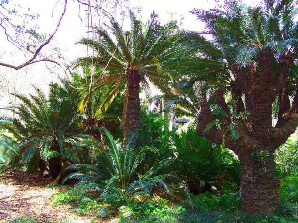Las plantaciones también incluyen las camelias , árboles helechos y apalachina Damon acebo , jazmín asiático , Justicia , Crinen y lirio araña , montera , mítica , la fecha y la palma saber , papiro , filodendro , azul grafito azul , y la cola de caballo punta ( Juncaceae) .