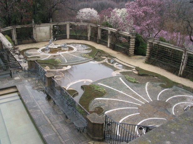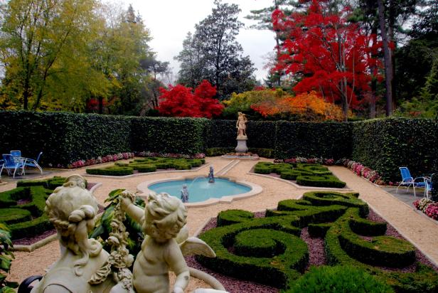 Una vez más diseñado por Innocenti y Webel, el jardín se divide en cuatro áreas con canales de agua en movimiento, los senderos de grava y una piscina central que está recubierto con baldosas de vidrio italiano. Va acompañada de esfinges de mármol , un querubín y los animales del mar en la piscina central, así como muebles de exterior de la colección de correos.