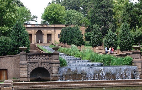 Una cascada de agua de las cuencas vinculadas se planeó para la empinada cuesta hacia el sur, terminada por espejos de agua rectangulares en una plaza al pie de la colina. En 1917, el arquitecto paisajista Horace Peaslee reemplazado Burnap pero en gran parte se mantuvo fiel a las intenciones de Burnap; Sin embargo, Peaselee abandonó los elaborados jardines formales de las partes altas del parque y los reemplazó con un centro comercial abierto. La construcción del parque se basó en técnicas y materiales avanzados para su tiempo. Las terrazas, paredes y pavimentos, casi todos los elementos estructurales en este altamente estructurado paisaje-se prestan en pre-cast y moldeado en el lugar concreto tratado en una variedad de maneras. El contratista de concreto, John J. Earley, era un artesano altamente experto que interpreta pavimentos, urnas, balaustradas, nichos, y recipientes de siembra de mosaico en el hormigón.