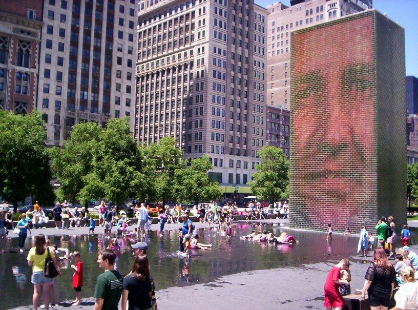 La Fuente de la Corona es una obra interactiva de arte público y la escultura de vídeo , llamado así en honor de Chicago de la familia Corona y diseñado por el artista catalán conceptual Jaume Plensa Se abrió en julio de 2004 . La fuente se compone de un espejo de agua de granito negro situado entre una pared de transparente cristal de ladrillo . Las torres tienen 15 m de altura, y usa de diodos emisores de luz detrás de los ladrillos para mostrar videos digitales en sus rostros hacia el interior. Construcción y el diseño de la Fuente de la Corona un costo de $ 17 millones.