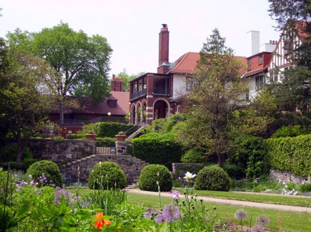 Amplios jardines formales en niveles descendentes desde la casa hasta el lago fueron ejecutados basan en conceptos de jardinería paisaje inglés de la época. Camas de siembra se colocaron en torno a un marco de muros, setos y caminos pavimentados. Esta franja central de formal fue flanqueado por Wilder, zonas boscosas a cada lado de la mansión. Senderos serpentean a través de estos bosques y una pasarela pintoresca de piedra se extiende por un afluente que desemboca en el lago.
