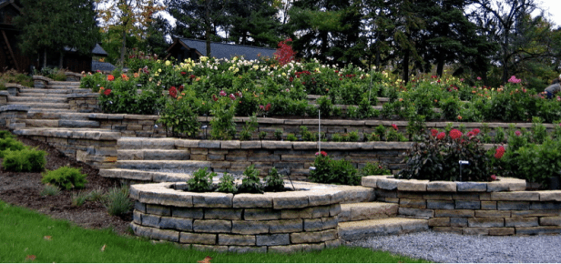 Área de descanso Jardín – Clematis y rose vines, con una de las fuentes al aire libre más altos de Minnesota.