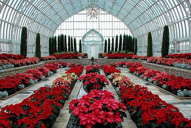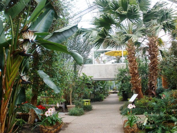 La casa Palm, mantenida a 70 ° F, se encuentra bajo la cúpula, y contiene una variedad de tropicales árboles y palmas de las manos , incluyendo el ventilador de palma china ( Livistona chinensis ), la palma cola de pescado ( Caryota mitis ), el árbol de paraguas (Schefflera actinophylla ) y la palmera Canaria ( Phoenix canariensis ). Cuando un árbol llega a la cima de la cúpula debe ser reducido, ya que no pueden ser podados a la altura. La casa Tropical, 70 ° F, contiene plantas frutales y árboles tales como la fig común , naranja calamondin y plátano Sangrienta, y plantas con flores tropicales como el powderpuff rosa ( Calliandra brevipes ) y lirio de la paz ( Spathiphyllum ). La casa Cactus, 62 ° F se alinea en toba roca y tiene una variedad de cactus y suculentas , incluyendo caramelos ( Sedum pachyphyllum ), el cactus dólar de plata ( Opuntia robusta ), «hombre viejo» cactus ( Cephalocereus senil is) y la planta de jade ( Crassula ovata ). El Fernery está hundida para proporcionar condiciones más frías y más humedad. Helechos como el Alsophila se pueden encontrar aquí, así como una pequeña cascada situada en el centro. El Show de casa cambia sus tiempos de visualización muchos en todo el año y también se utiliza para muchas exposiciones de flores del invernadero y eventos especiales. Los jardines perennes se encuentran fuera al norte del vestíbulo.