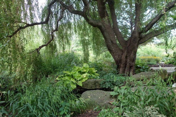 Hosta Hillside.-Situado a lo largo de la orilla del «Hidden Lake» (Lago Escondido), el jardín en la ladera es el lugar sombreado perfecto para el cultivo de hostas. Más de 700 variedades se muestran aquí desplegando una gran variedad de colores del follaje, texturas y tamaños de hosta que están disponibles. Otras plantas amantes de la sombra se entremezclan con las hostas a lo largo del arroyo en cascada y el estanque. Los narcisos proporcionan una pantalla de flores de primavera. En 1995 este jardín fue nombrado oficialmente y dedicado como el Ralph H. (Herb) and Dorothy Benedict Hosta Hillside.