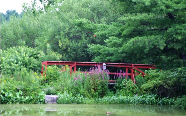 The Woodland Pond (La charca del arbolado), fue creada por una presa donde el agua hace una pausa antes de desembocar al arroyo «Poorhouse Brook» y corriendo hacia el sur hasta el estrecho de Long Island. Una charca es un cuerpo de agua lo suficientemente pequeño para que las olas no erosionen el suelo en sus orillas y lo suficientemente bajas para que las plantas acuáticas tengan la raíz en el fondo y todavía lleguen a la superficie. Si su visita es en el verano, te darás cuenta de que las hojas redondas y flores de color rosa pálido de los lirios de agua Nuphar advea en el centro y las hojas en forma de flecha del Peltandra virginica en los bordes. Cuando la flor Flecha Arum ha echado a perder el peso de las semillas se dobla el tallo largo y se hunde en el fondo fangoso, de esta manera las semillas se plantan a sí mismas.