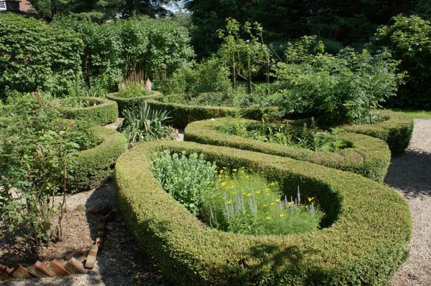 El patrón de la ventana se define por un seto de ligustro y lleno de arriates con mezcla de plantas con flores anuales y perennes proporcionan la multicolor «vidrieras».